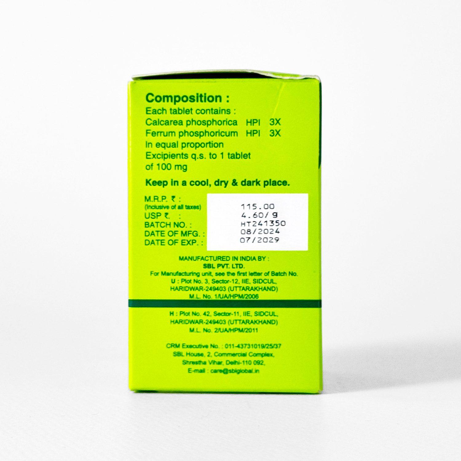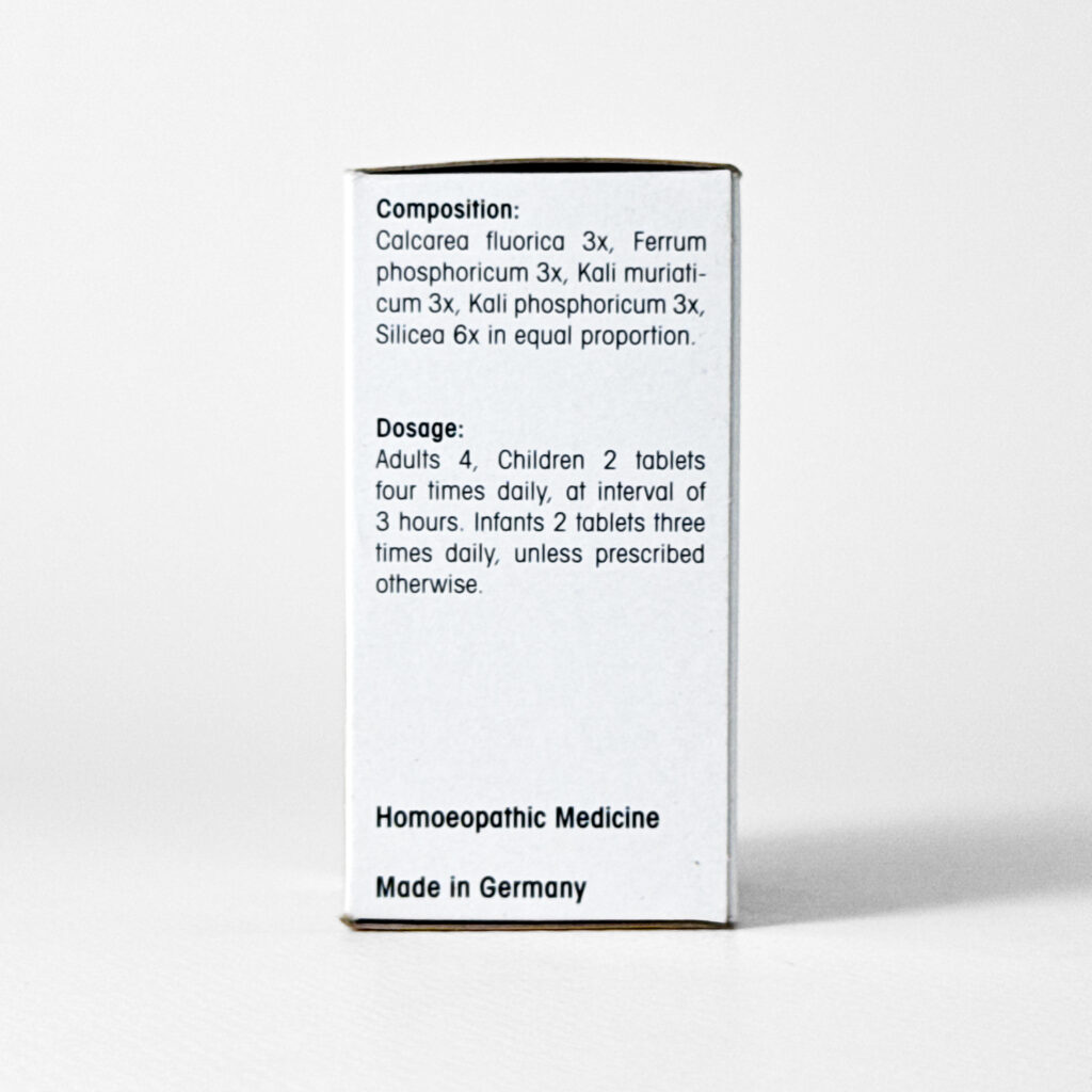 The combination supports healthy tooth development by supplying essential tissue salts needed during the teething phase.