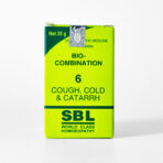 SBL Bio-Combination 6 Tablet is a homeopathic biochemic preparation formulated to relieve cough, cold and catarrhal conditions. It helps manage persistent cough with thick mucus, congestion of the chest, rattling sounds, irritation in the throat, and breathing discomfort associated with mucus accumulation. This combination supports healthier respiratory function by easing phlegm, reducing inflammation of the mucous membranes, and improving overall respiratory comfort.