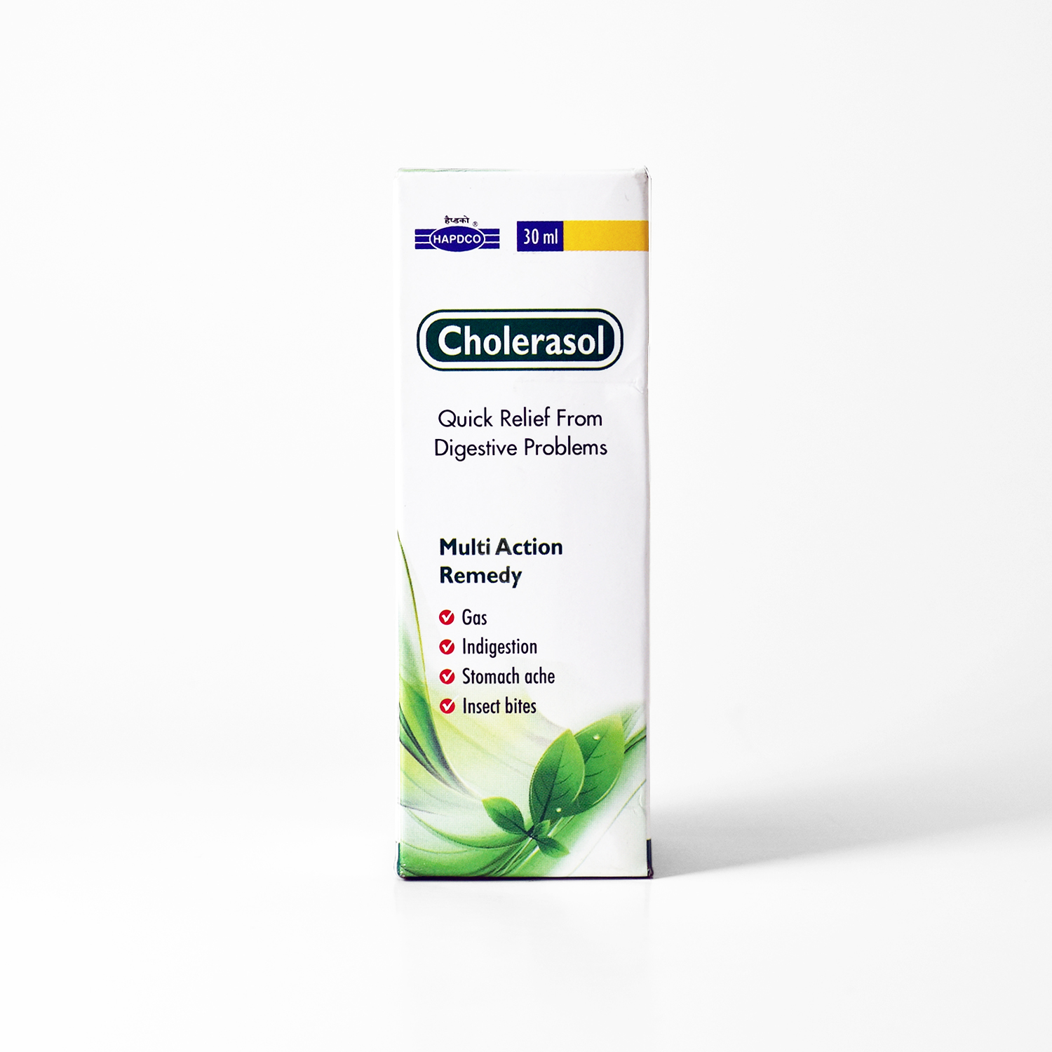 HAPDCO Cholerasol Drops is a homeopathic digestive remedy indicated for abdominal complaints, colic, dyspepsia, nausea, vomiting, and related symptoms. It is also used in cases of cholera, gastric pain, and insect bites, providing quick relief for a variety of gastrointestinal disturbances.