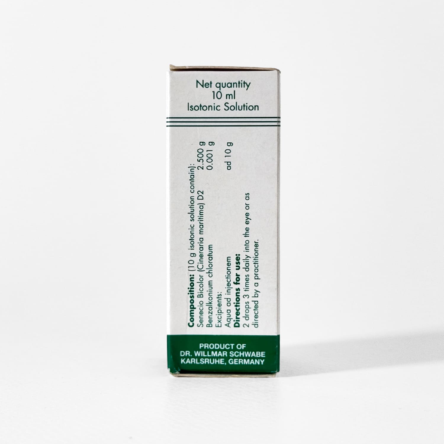 This eye drop formulation features Senecio bicolor (also known as Cineraria maritima) in dilution D2, prepared without alcohol, produced by Dr Willmar Schwabe, Germany. The product is designed for use in conditions like eye fatigue, strain (especially from prolonged screen exposure), dryness, mild irritation from dust or pollution, and early changes in lens or cornea transparency. It offers a gentle, homeopathic-based approach to supporting ocular comfort and health in everyday use.