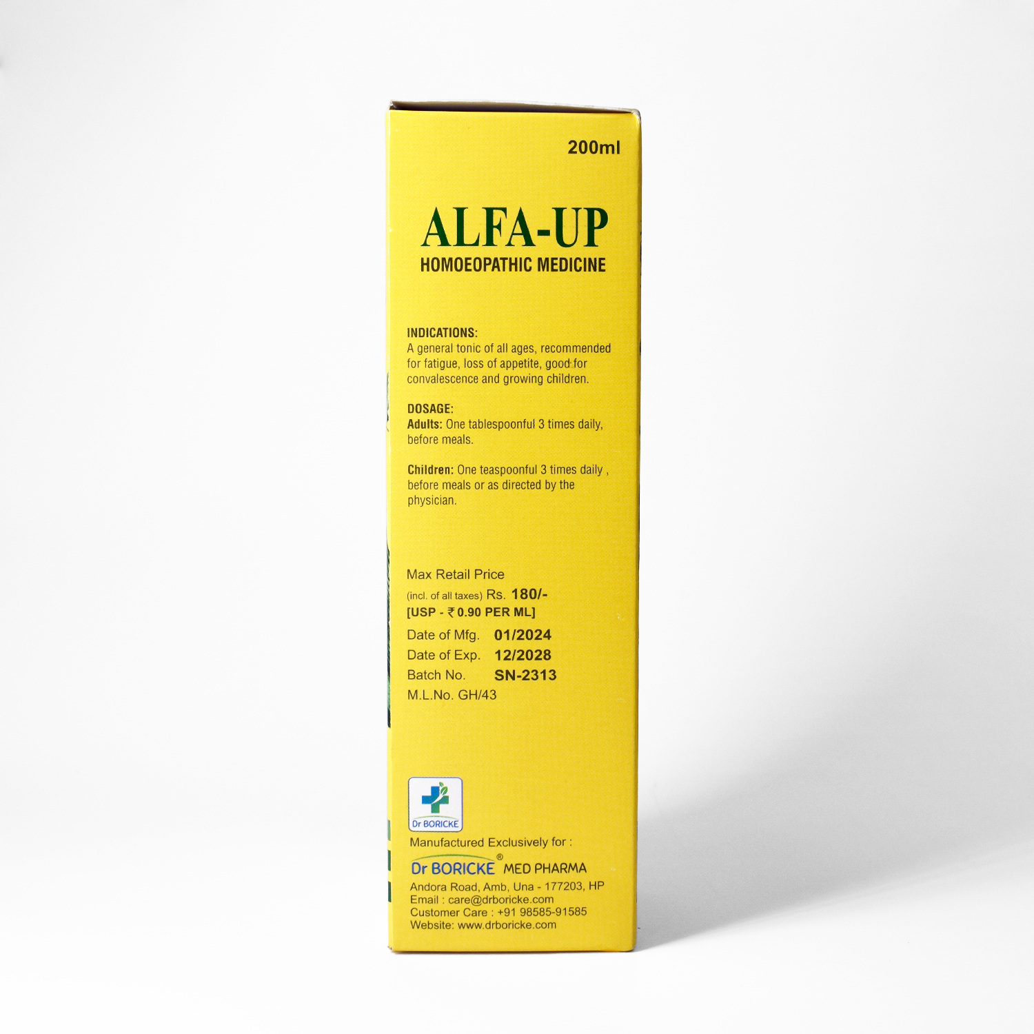Dr. Boricke Alfa-Up Syrup is a restorative tonic that boosts appetite, stamina, and recovery after weakness or illness.