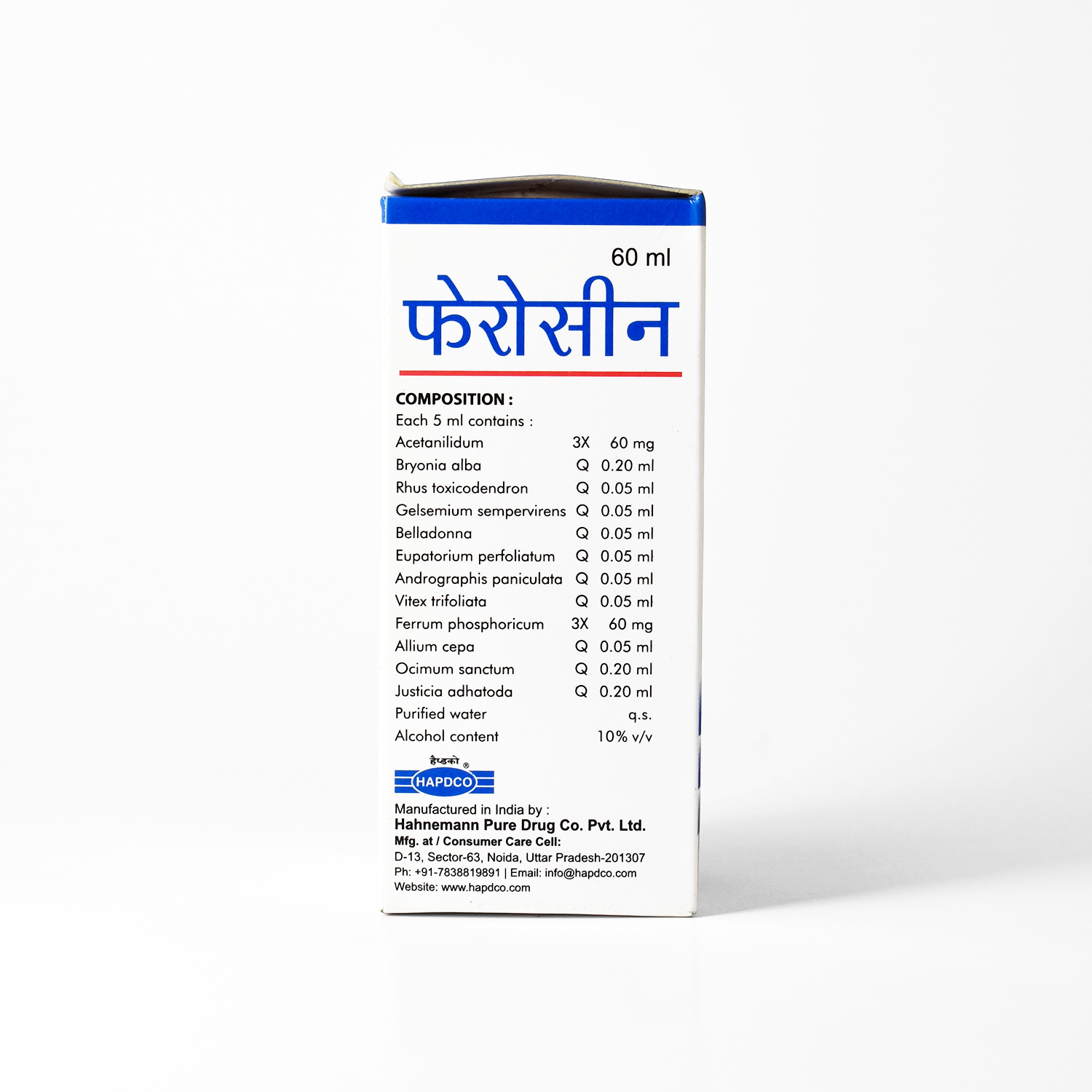 HAPDCO Ferrocin Syrup is a homeopathic antipyretic preparation, used in managing fever, cold, influenza, body ache, sneezing, and related symptoms. It helps reduce fever and soothe associated respiratory and systemic discomfort.