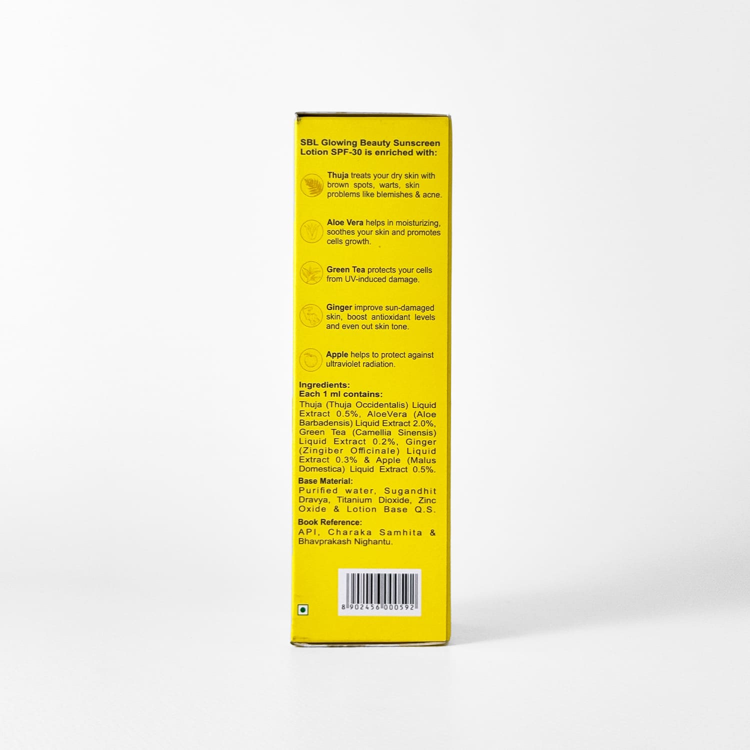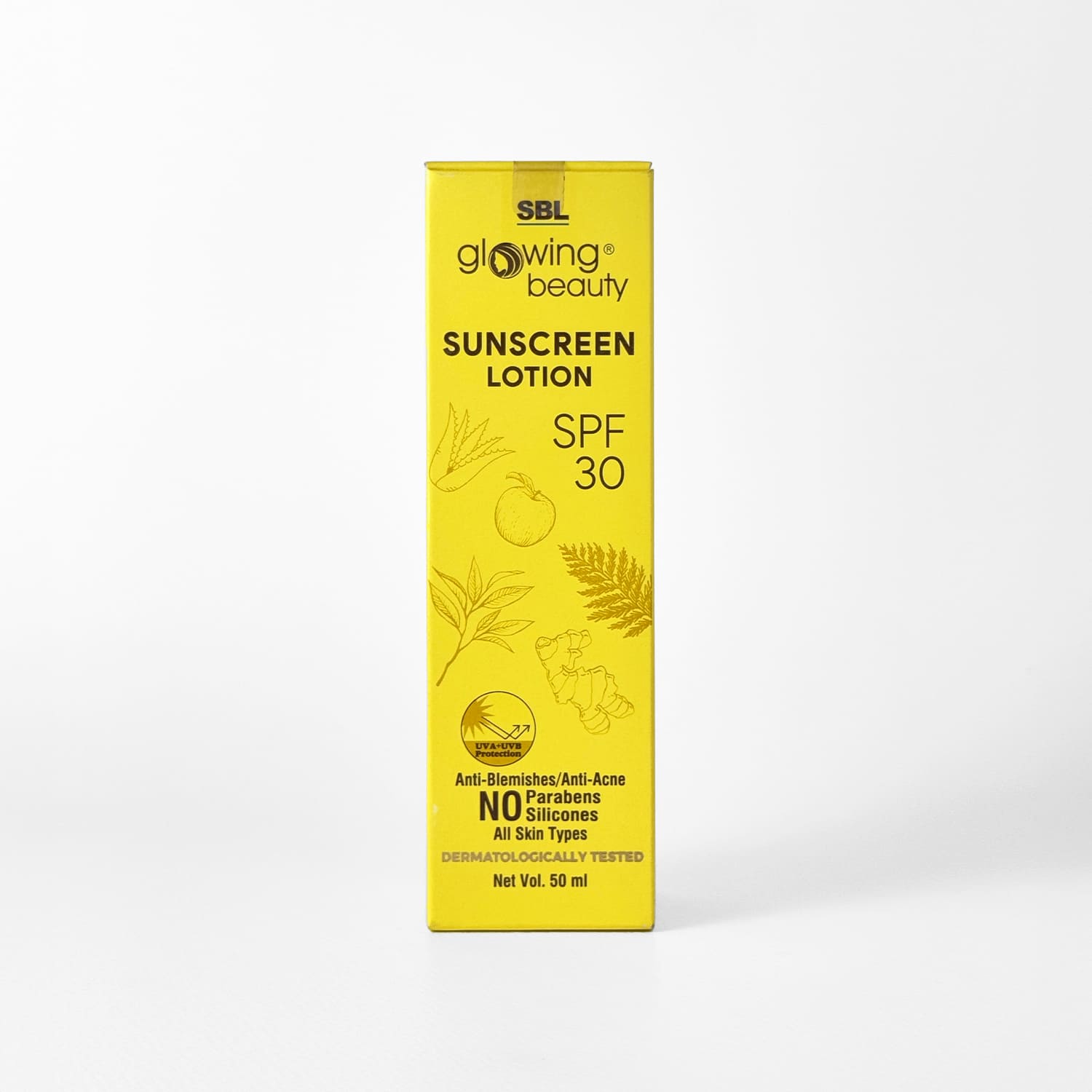 SBL Glowing Beauty Sunscreen Lotion SPF 30 is a lightweight, non‑greasy formula providing broad‑spectrum UVA/UVB protection while nourishing and calming the skin.