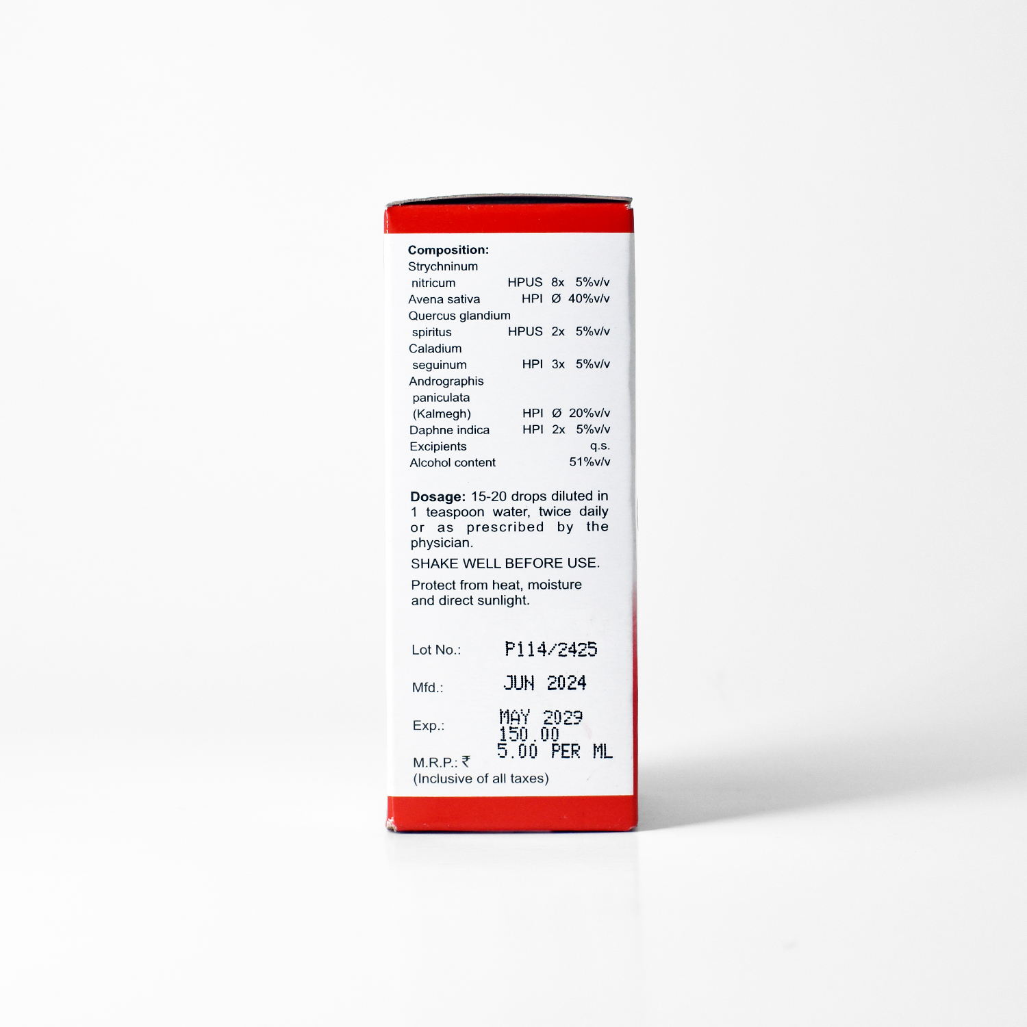10–15 drops in a little water, 2–3 times daily, or as prescribed by a physician.