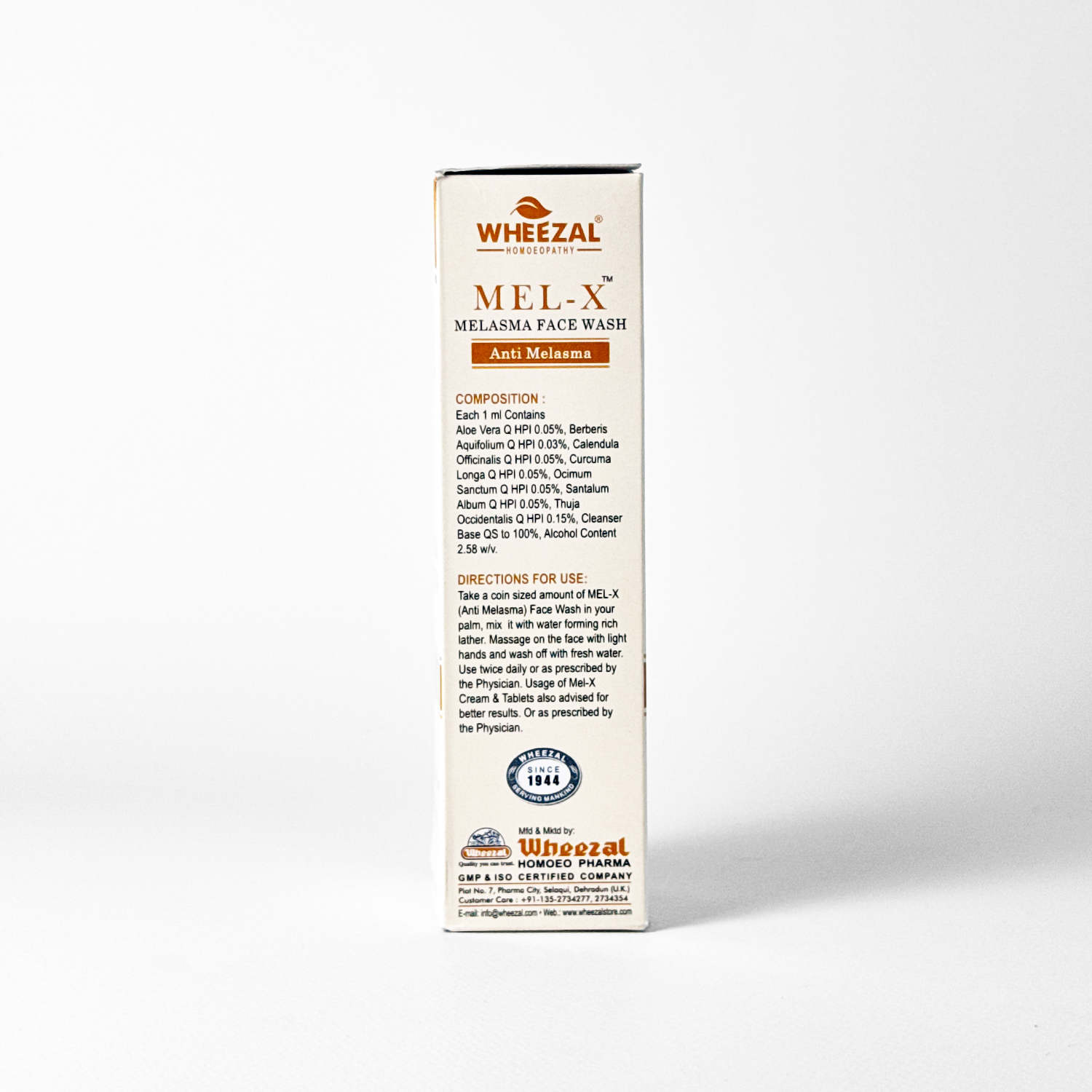 Wheezal Mel-X Face Wash is a homeopathic skin-care gel designed to support complexion clarity and reduce visible pigmentation (such as melasma). It gently cleanses the skin, targets uneven skin tone and dark patches, and promotes a fresher, more even-looking face.