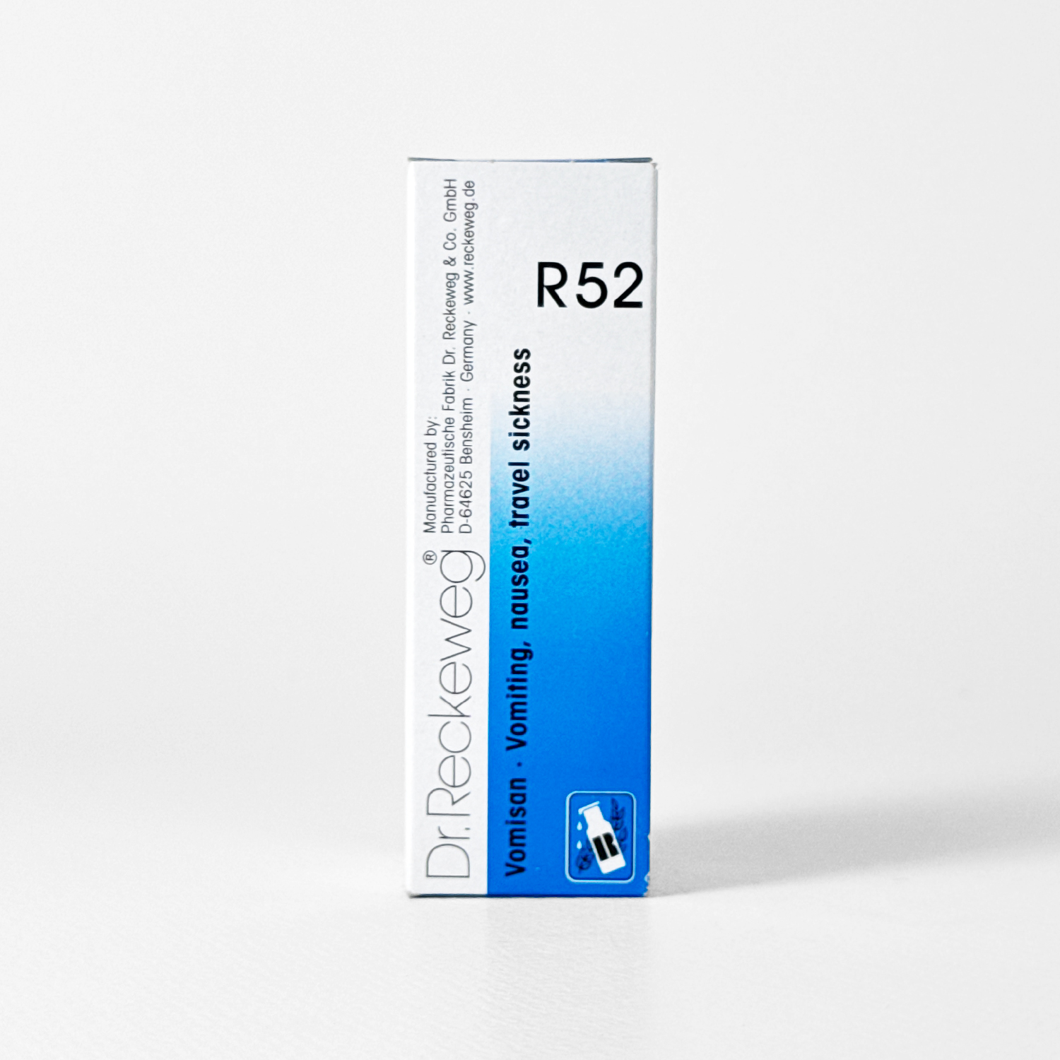 Dr. Reckeweg R52 Drops is a homeopathic formulation designed to relieve nausea, vomiting, motion sickness, and related digestive upsets. It acts on the gastrointestinal and nervous systems to ease queasiness, travel-induced nausea, and discomfort caused by illness or digestive imbalance. The drops help normalize stomach activity, reduce vertigo, and calm the nervous system to prevent recurrent nausea and vomiting episodes.