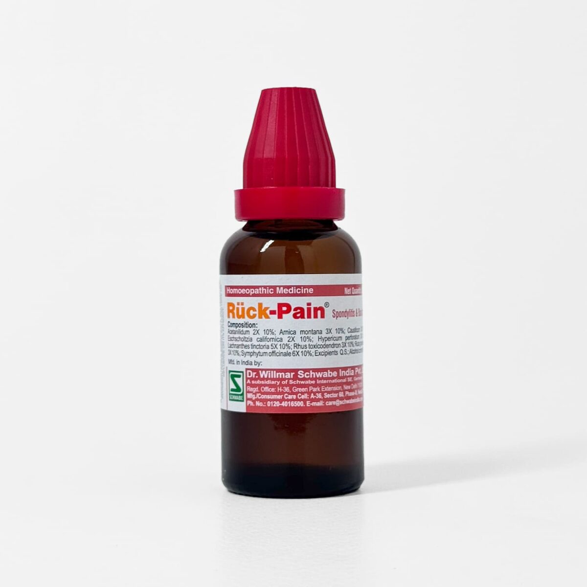 Ruck‑Pain Drops are a homeopathic liquid remedy formulated to relieve acute and chronic back, joint, and muscular pain, including cervical and lumbar spondylitis.