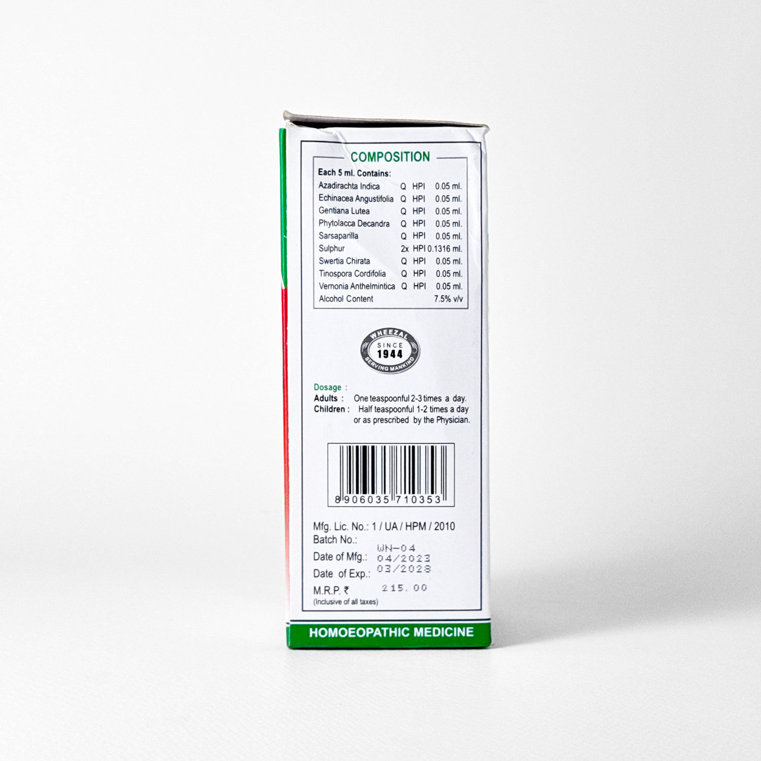 Wheezal Sarsa Syrup is a homeopathic liquid formulation aimed at purifying the blood and supporting skin, liver and immune function. It is used in skin eruptions, acne, scabies, pustules, and urinary-or glandular irritation, while also aiding detoxification of the system.
