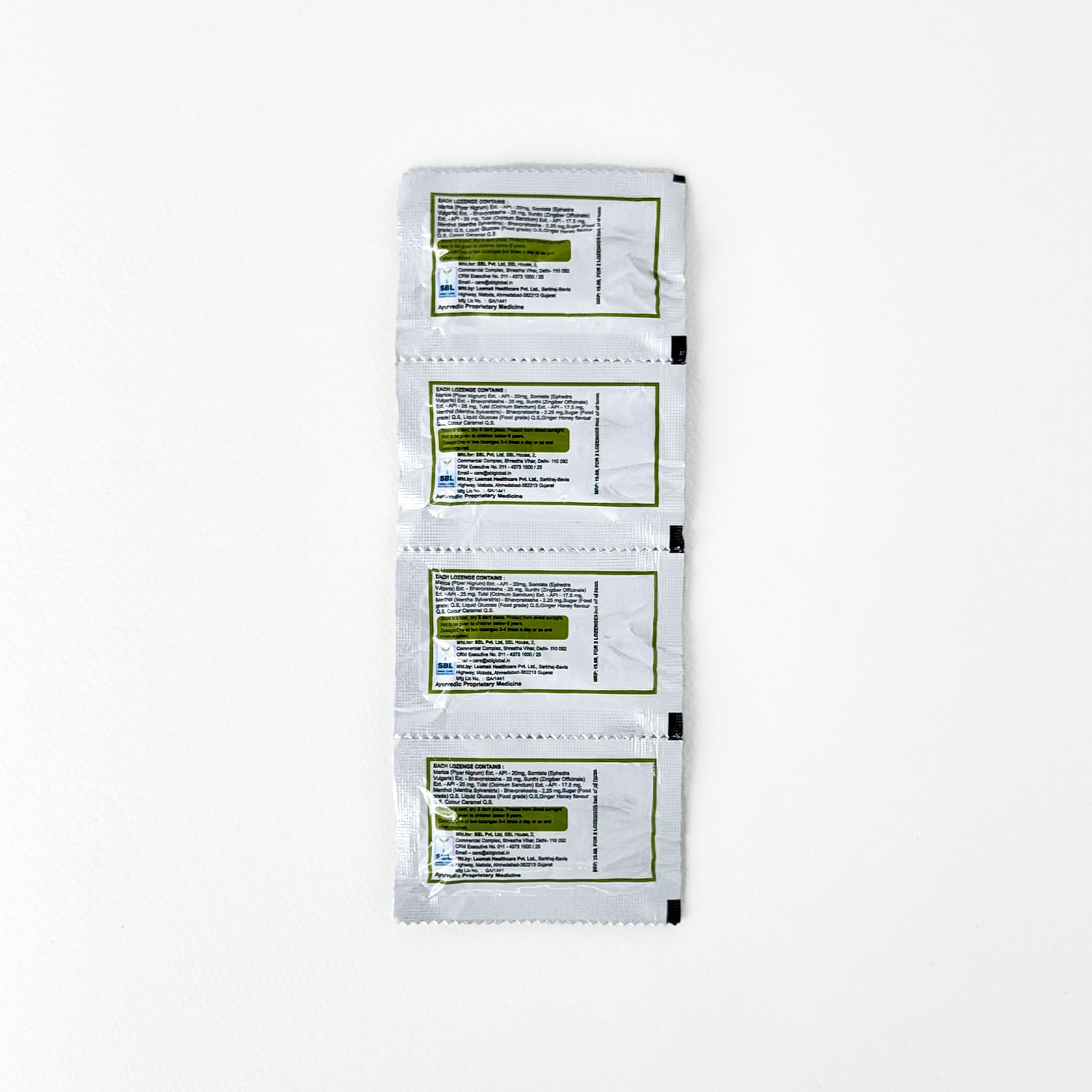 Portable ginger-honey-tulsi lozenges to relieve throat soreness, cough, and irritation using natural homoeopathic blends.